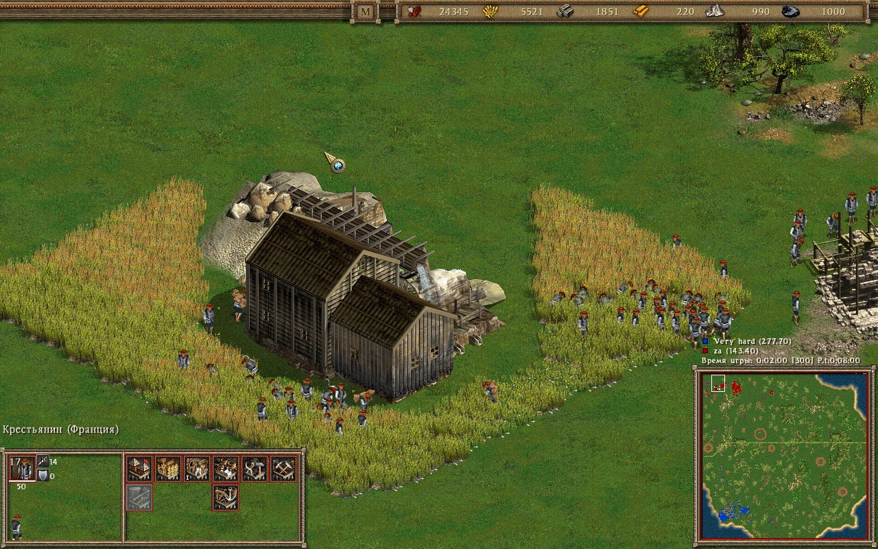 Крестьяне слева собрали свою еду и устремились к пшенице в противоположном углу, но пока дошли ее собрали. Время 1 минута 38 секунд и голод!